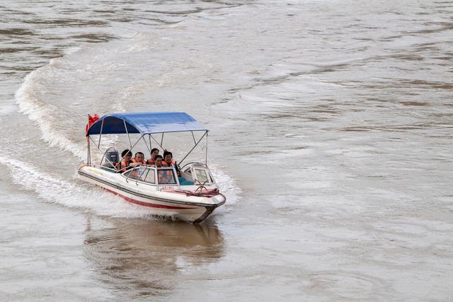游客在磧口古鎮(zhèn)內(nèi)乘船游覽(6月9日攝)。