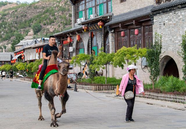 游客在磧口古鎮(zhèn)內(nèi)騎乘駱駝(6月9日攝)。