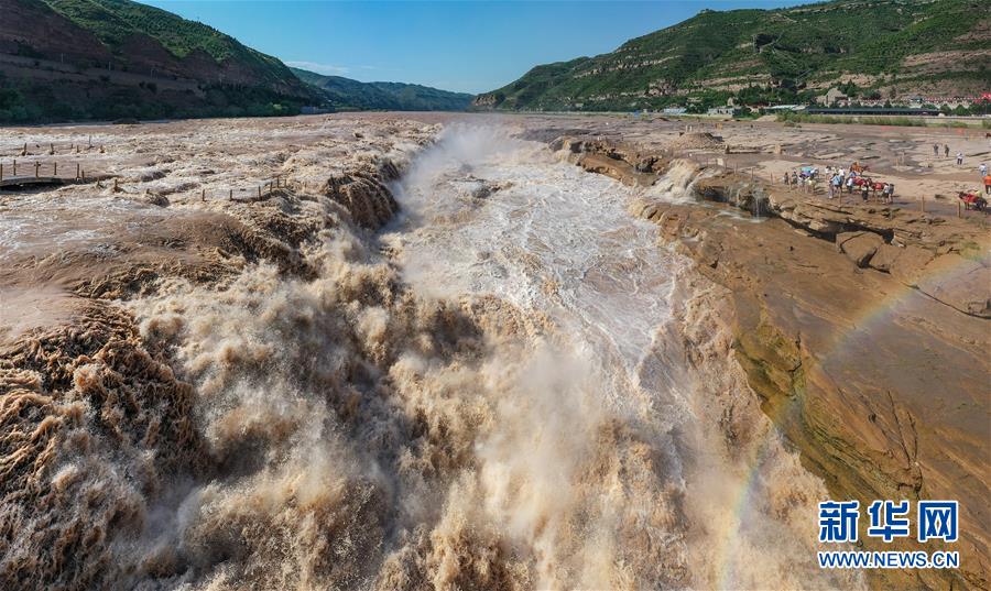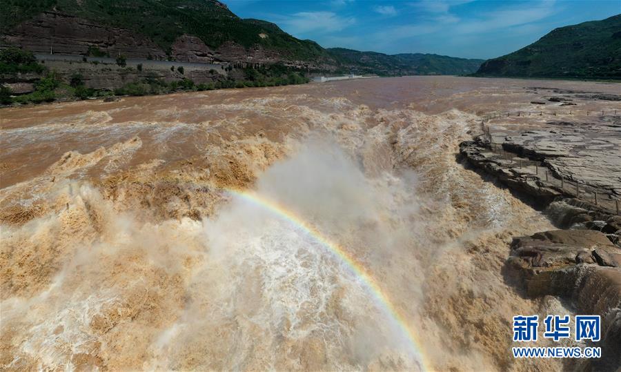 7月7日,黃河壺口瀑布主瀑上出現(xiàn)彩虹(無人機(jī)照片)。近日,位于秦晉大峽谷的黃河壺口瀑布出現(xiàn)難得一見的“金色瀑布”景觀。新華社記者陶明攝
