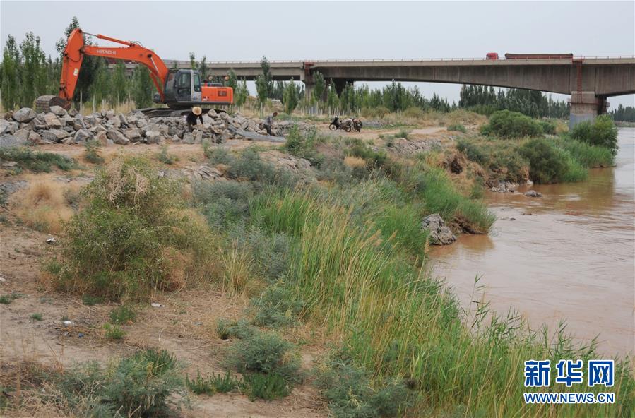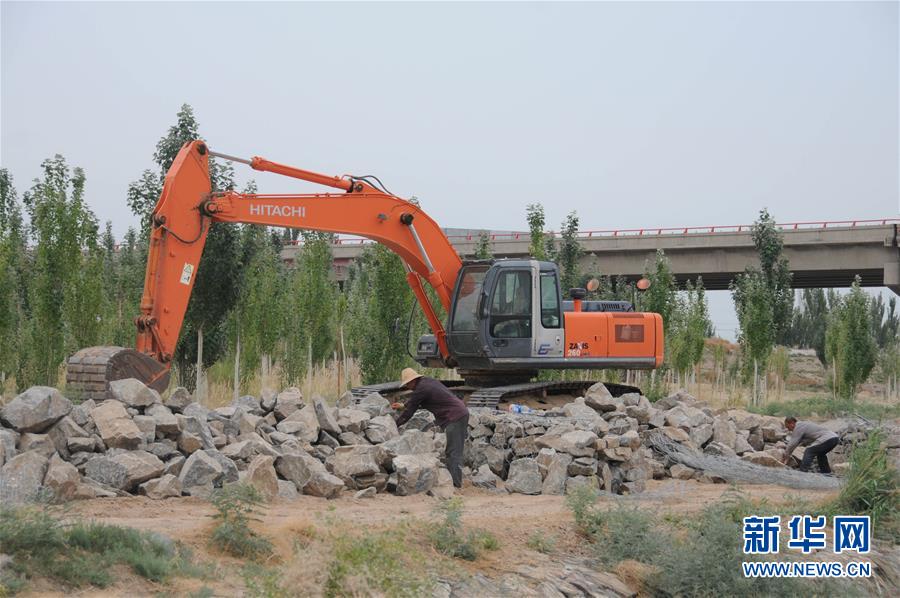 7月11日,工人在黃河內(nèi)蒙古磴口段南套子險(xiǎn)工段進(jìn)行除險(xiǎn)加固。新華社記者李云平攝?