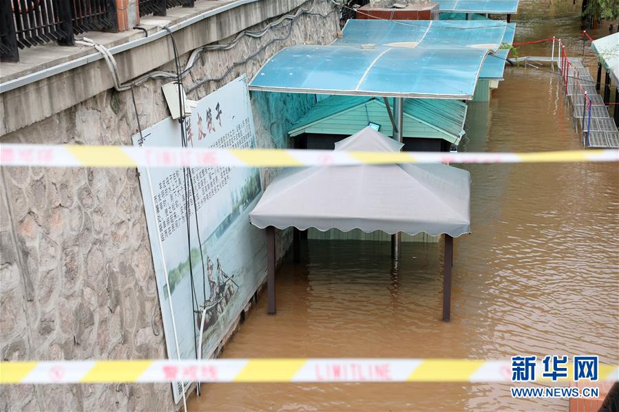 在蘭州市城關(guān)區(qū)黃河蘭州段南岸,被淹的羊皮筏子售票處門口拉上了警戒線(7月21日攝)。新華社記者馬莎攝