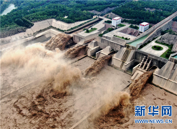 這是7月8日拍攝的黃河小浪底水利樞紐泄洪的場(chǎng)景(無(wú)人機(jī)照片)。新華社記者李安攝