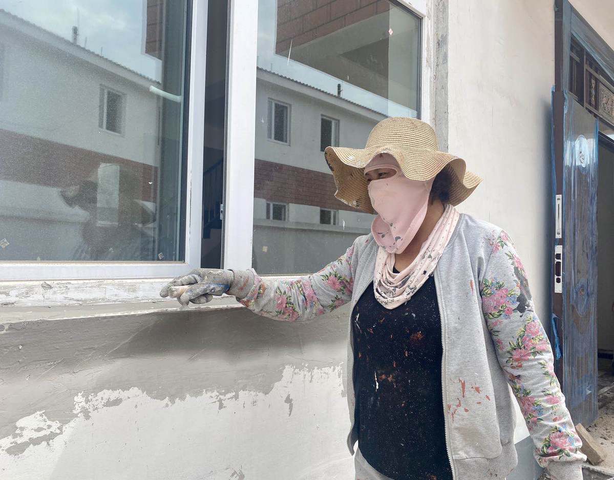 張秋菊在為村臺社區(qū)的新房粉刷墻壁。 (趙瑞雪攝影)