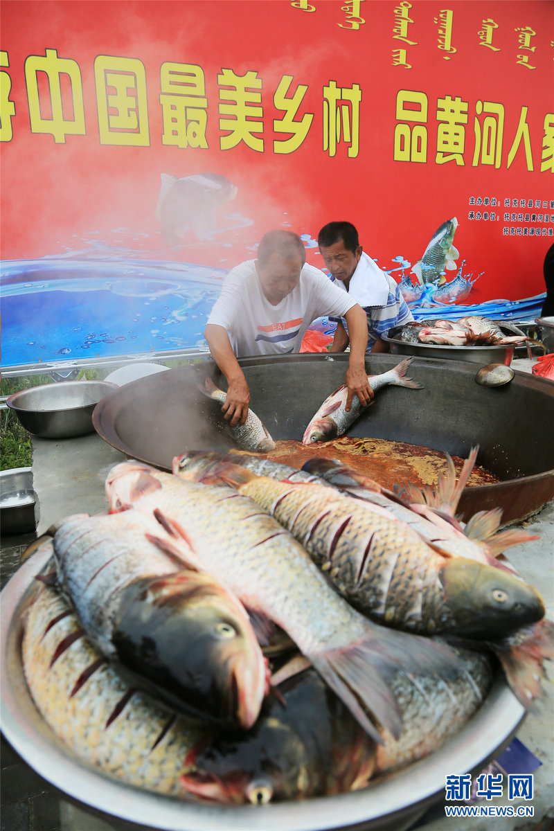 活動(dòng)現(xiàn)場(chǎng),由本地村民掌勺,將五百多斤黃河鯉魚和白鰱放入兩口直徑1.2米的大鍋中進(jìn)行燉制,吸引了眾多游客前來品嘗。新華網(wǎng)發(fā)(馬斌攝)