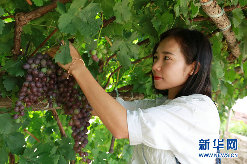 8月29日,游客在郝家窯村神泉山莊采摘葡萄。新華網(wǎng)發(fā)(馬斌攝)