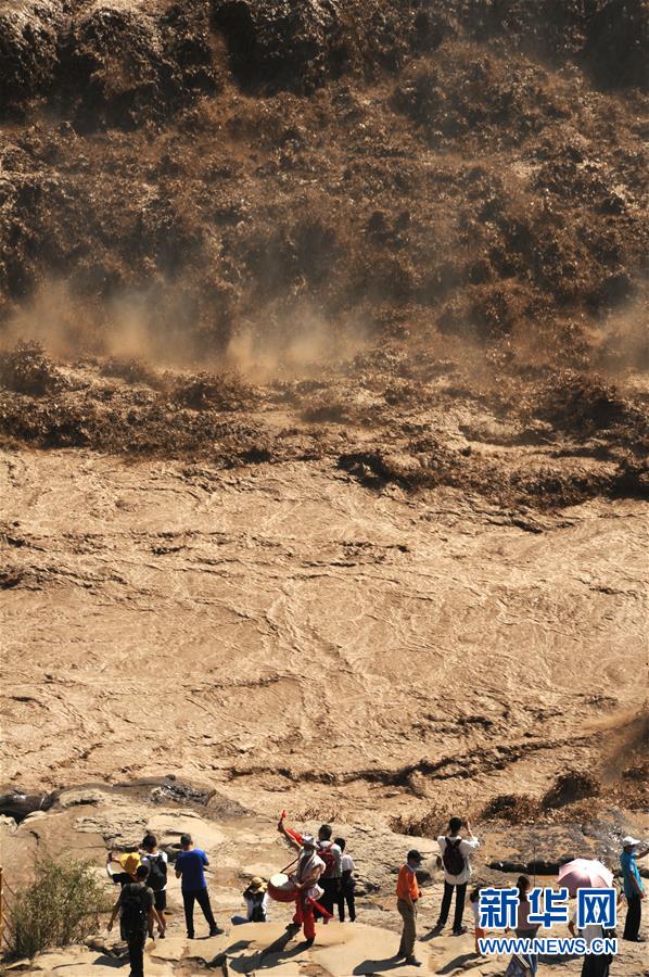 8月26日,游客在壺口瀑布景區(qū)欣賞鑼鼓表演。近日,受上游降雨和水庫(kù)泄洪影響,黃河壺口瀑布水量增大,形成壯美瀑布群,吸引眾多游客觀景賞瀑。新華社記者馬毅敏攝