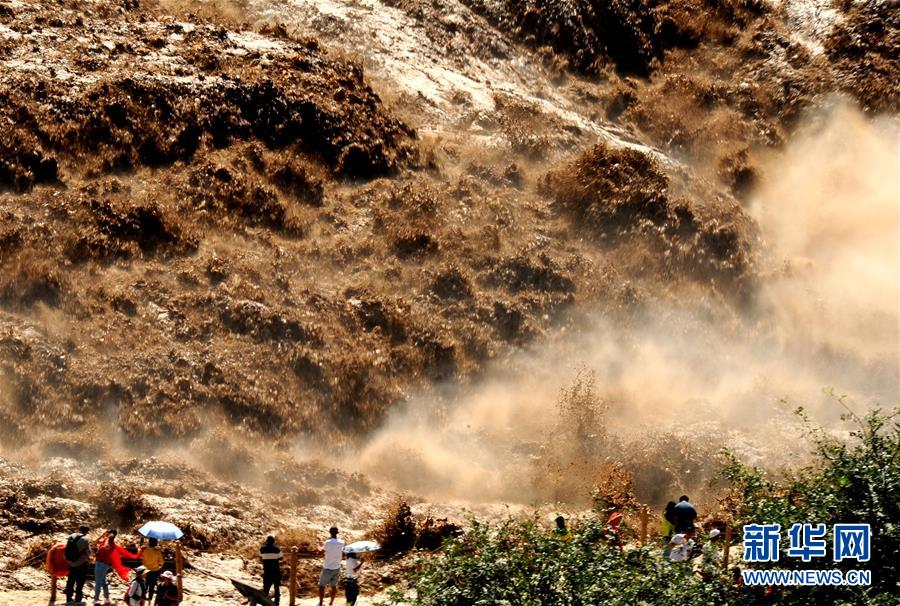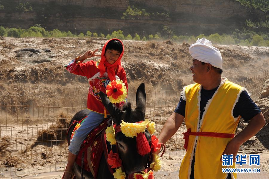 8月26日,來(lái)自河南安陽(yáng)的游客在壺口瀑布景區(qū)拍照留念。近日,受上游降雨和水庫(kù)泄洪影響,黃河壺口瀑布水量增大,形成壯美瀑布群,吸引眾多游客觀景賞瀑。新華社記者馬毅敏攝