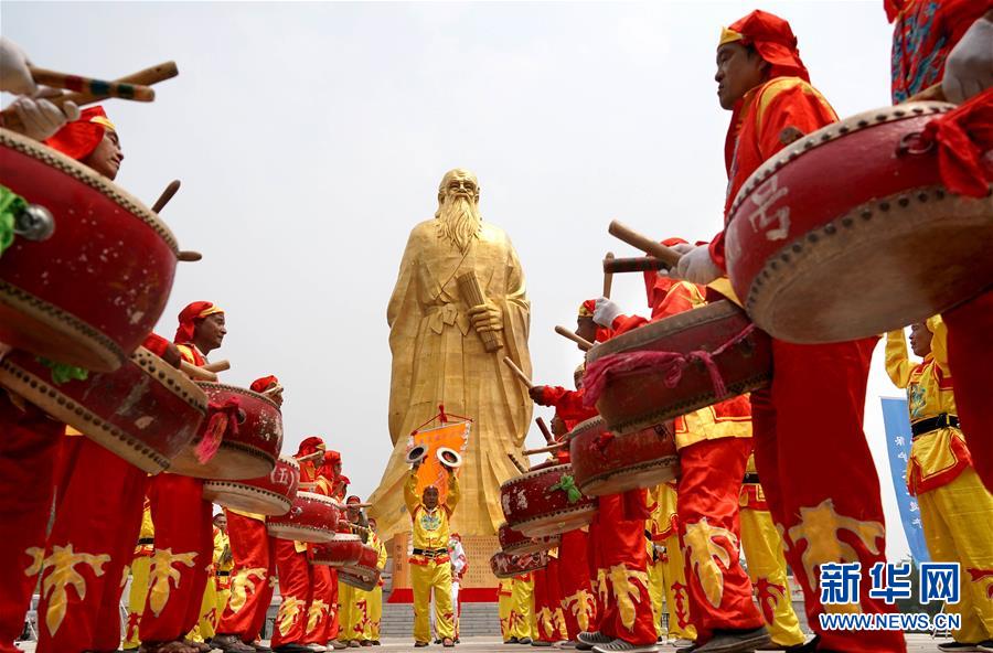 表演團(tuán)隊在函谷關(guān)歷史文化旅游區(qū)內(nèi)的老子像前表演(6月13日攝)。新華社記者李安攝