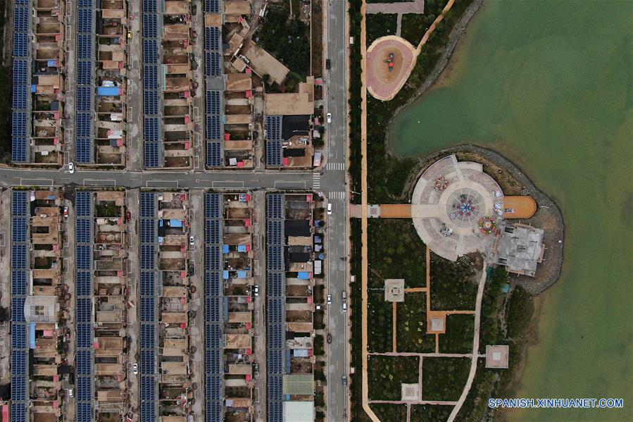 Vista aérea del 11 de agosto de 2020 de la aldea de Deji en la prefectura autónoma tibetana de Huangnan, provincia de Qinghai, en el noroeste de China. La aldea de Deji es una aldea reubicada en la orilla del río Amarillo. Después de que se completara la reubicación en 2017, la aldea de Deji, basándose en las ventajas de su ubicación, explora la estrategia de mitigación de la pobreza y revitalización rural, que incluye el turismo y la promoción cultural, al mismo tiempo que introduce también la industria fotovoltaica.