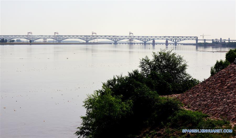 Vista aérea del 19 de mayo de 2020 del puente en construcción sobre el río Amarillo en Zhengzhou, provincia de Henan, en el centro de China. El puente de 2.016 metros de largo fue unido el martes. El piso superior es una autopista de seis carriles, mientras que el piso inferior es para un ferrocarril de cuatro vías. El puente forma parte de la línea ferroviaria que va desde Zhengzhou a Jinan, en la provincia de Shandong, en el este de China.