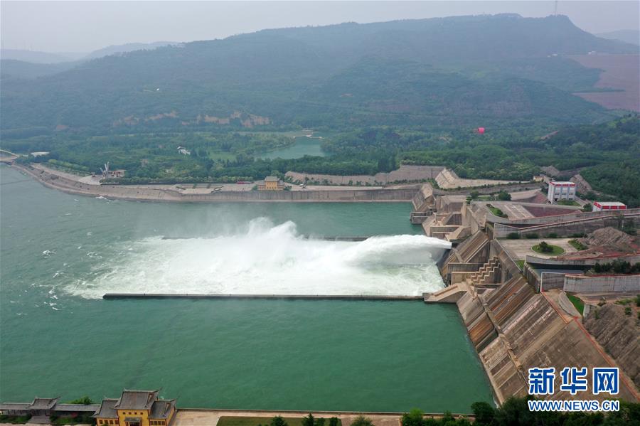 23日に撮影された黃河小浪底水利中樞プロジェクト(ドローンで撮影)。黃河小浪底水利中樞プロジェクトはこのほど、洪水調(diào)節(jié)運(yùn)用モードに入った??栅樘鳏幛毪葔延Qな光景だ。