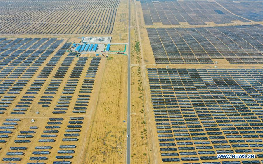 Aerial photo taken on Sept. 14, 2020 shows the Dalad Photovoltaic Power Base in the Kubuqi Desert in north China's Inner Mongolia Autonomous Region. (Xinhua/Lian Zhen)