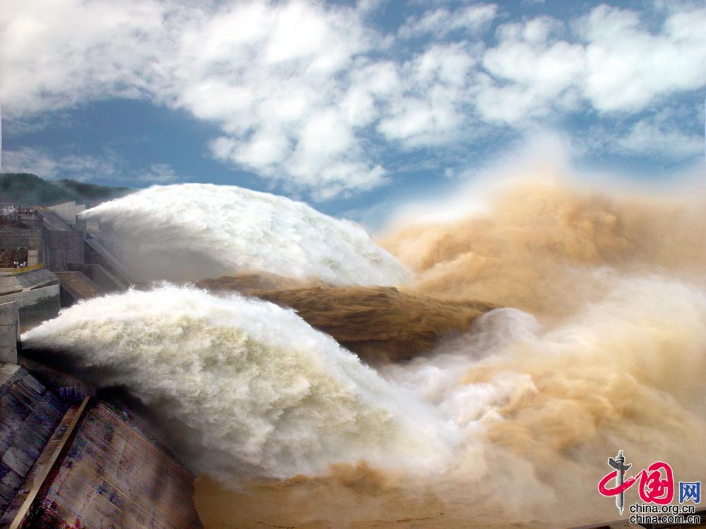 Am 4. Juli dieses Jahres begann die Talsperre wieder damit, Wasser und Sandsedimente zu regulieren und trat damit in die beste Phase ein, um die monstr?sen Wasserstr?me zu bestaunen. W?hrend der Reinigung des Wassers vom Schlamm sprudelten die Stromschnellen des Gelben Flusses aus den H?hlen des Damms. Dadurch ergab sich ein Anblick, als würde das Wasser des Gelben Flusses ?vom Himmel kommen.“