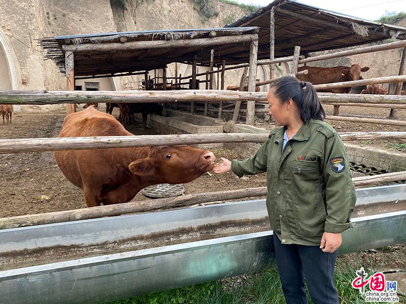 平頭溝村朱海萍輕撫她的牛。中國網記者孫靈萱攝