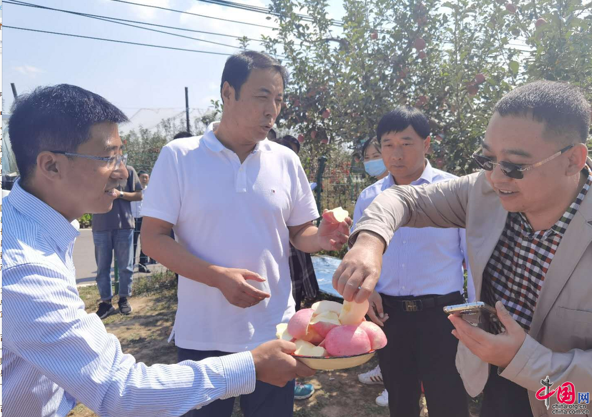 El día 20 por la ma?ana, tras despedirnos de la majestuosa catarata de Hukou, condujimos unos 30 kilómetros al sureste a través de rutas monta?osas de exuberante vegetación para llegar a las famosas plantaciones de manzanas del pueblo de Dongcheng, distrito Ji en Linfen, provincia de Shanxi. Gran parte de las frutas estaban ya en bolsas y yacían bajo el sol del medio oto?o con su rojo provocador. A simple vista, podían distinguirse 3 colores: rojo, amarillo y verde (manzanas rojas, cascadas amarillas, entorno verde) una mezcla que caracteriza la erradicación de la pobreza en la localidad.