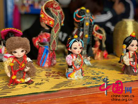 На фото: секретарь партийной ячейки района Байхэ уезда Жоэргай, наследница нематериального культурного наследия Чжан Хуэйлин знакомит журналистов с мастерской ?Счастливые куклы?.