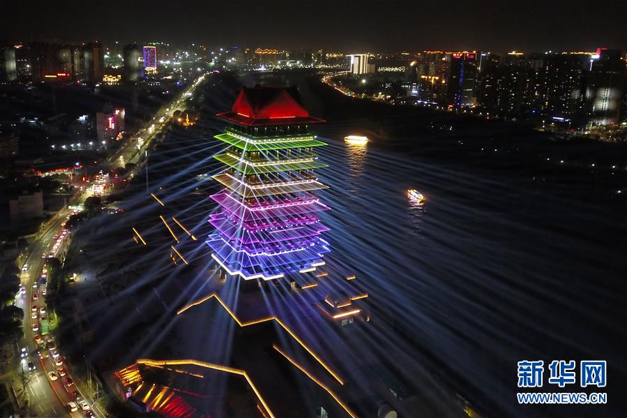 這是9月29日拍攝的蘭州黃河樓夜景(無(wú)人機(jī)照片)。新華社記者杜哲宇攝