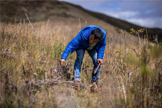 “這些地方以前都是流沙,現(xiàn)在它們已經(jīng)被牢牢鎖住了?!彼拇ò稳魻柹w縣轄曼鎮(zhèn)西倉村治沙點(diǎn),若爾蓋縣林業(yè)和草原局生態(tài)修復(fù)科工程師涂勝彎下腰,從地上隨手抓起一把沙土,反復(fù)揉捻。遠(yuǎn)處,昔日荒坡已生發(fā)出層層青綠,遠(yuǎn)遠(yuǎn)看過去,荒坡被高山柳沙障編成的網(wǎng)圍欄覆蓋,沙化地塊被牢牢“鎖”住,留下深淺不一,大小均勻的網(wǎng)痕。