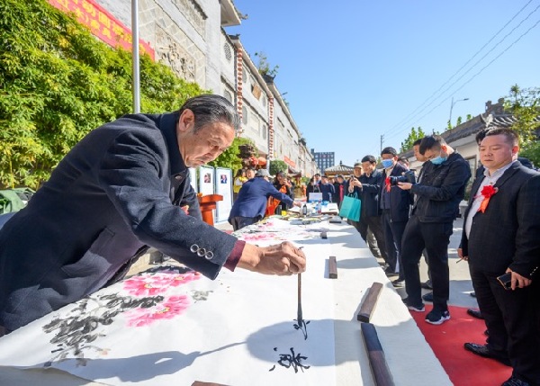 挽袖、研墨、調(diào)色、揮毫……張培華、傅偉華、孫書海、張景旺4名河南書畫名家現(xiàn)場執(zhí)筆,共同完成八尺整張畫作《黃河之春》,畫作以“遠聞滾滾浪淘聲,俯瞰長堤柳絮青。百卉千花春日至,鶯歌燕舞頌清平”為創(chuàng)作背景,寓意黃河流域迎來了高質(zhì)量發(fā)展的春天。