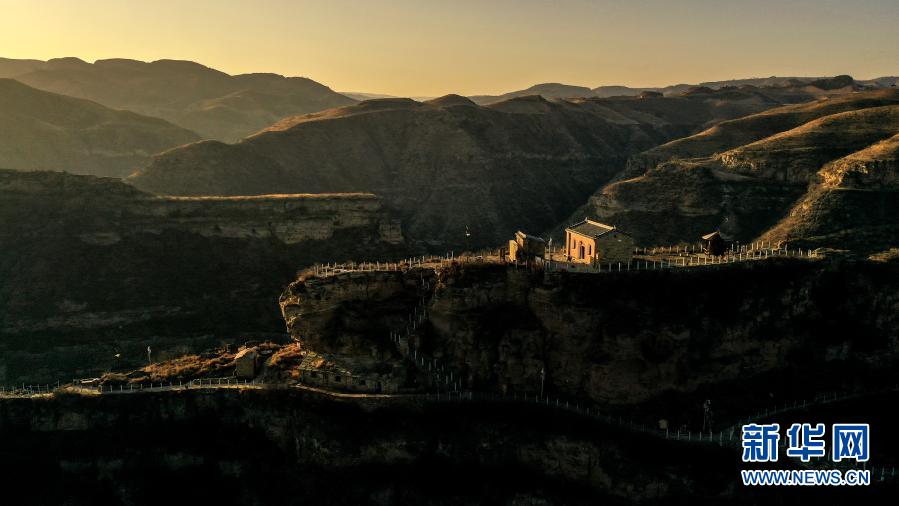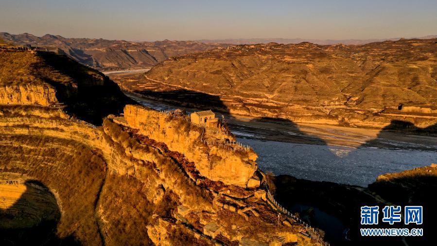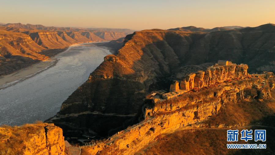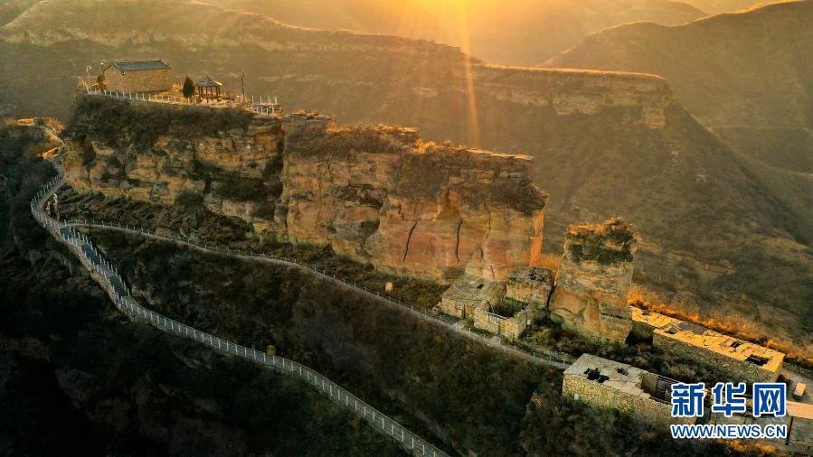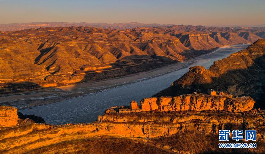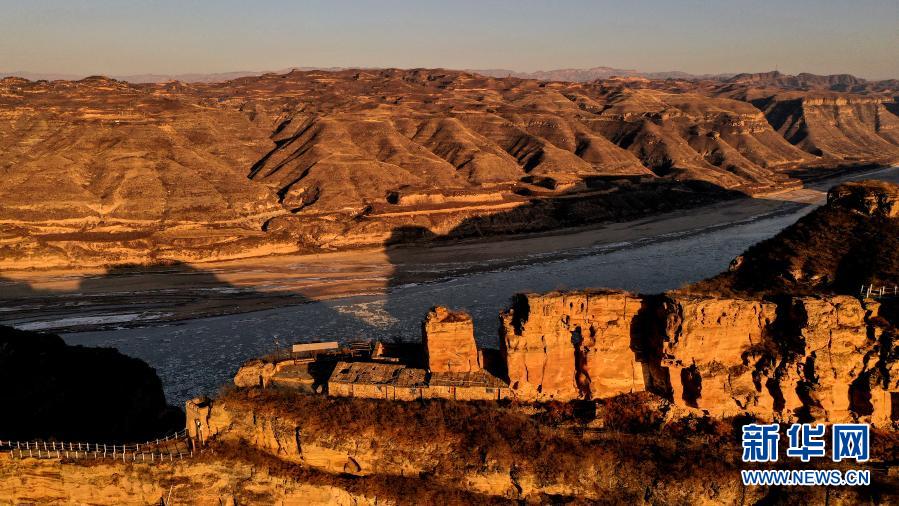 12月15日拍攝的夕陽下的會峰寨(無人機照片)。會峰寨位于陜西省延川黃河蛇曲國家地質(zhì)公園內(nèi),東臨黃河,四面峭壁嶙峋,僅西北有條小徑與古寨相通,古寨建筑建于明代嘉靖二十五年,曾是軍事防御工事,現(xiàn)已成為當(dāng)?shù)匾惶幹包c。新華社記者陶明攝