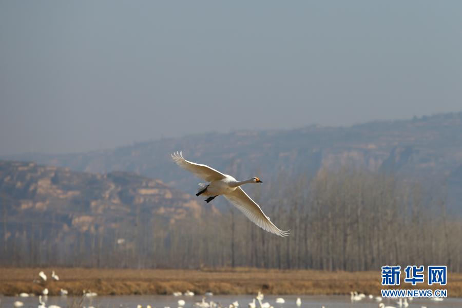 12月21日,白天鵝在三門峽百里黃河生態(tài)廊道的一處濕地上空飛翔。