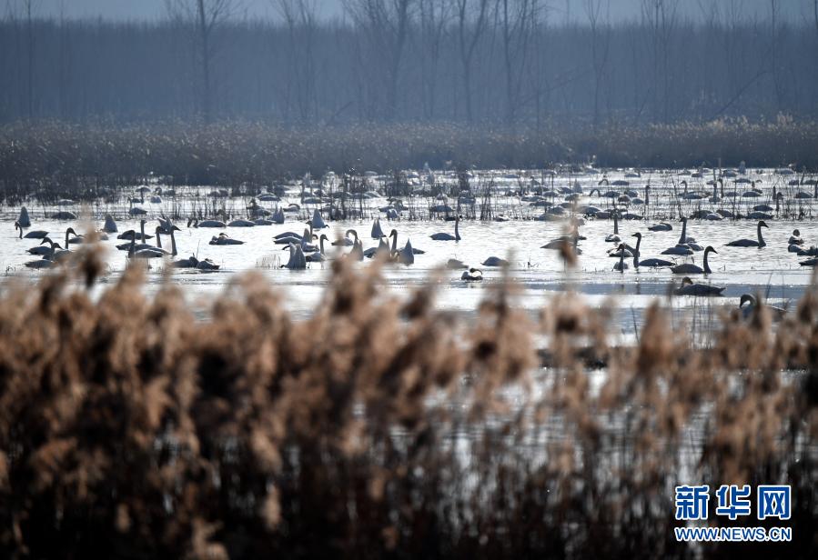 12月21日,白天鵝在三門峽百里黃河生態(tài)廊道的一處濕地棲息。