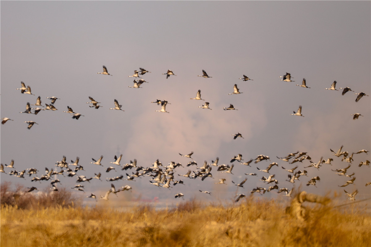 參與調(diào)查的鳥友楊晨希在黃河石嘴山段拍到的群飛的灰鶴。(楊晨希攝)