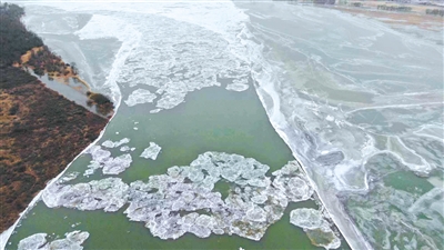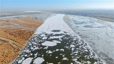 去年12月,寧蒙水文水資源局隊員用無人機拍攝的黃河寧夏河段凌情狀況。