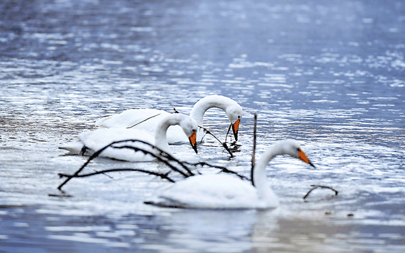 1月23日,大天鵝在青海貴德縣境內(nèi)的黃河休憩。隨著氣溫回暖,黃河成為大天鵝的越冬“港灣”。
