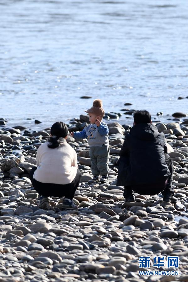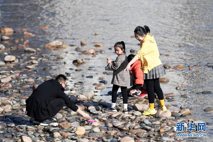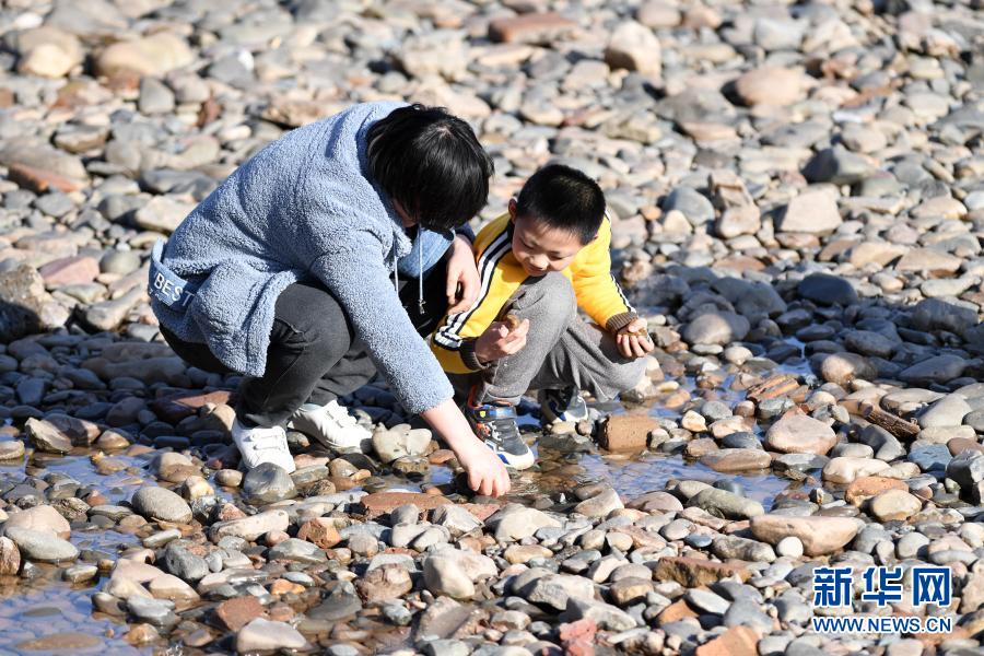 2月18日,市民帶著孩子在黃河蘭州段河床上撿石頭。新華社記者范培珅攝