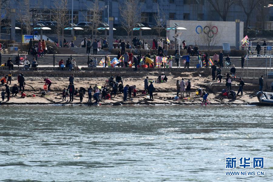2月18日,市民在黃河蘭州段河床邊游玩。新華社記者范培珅攝