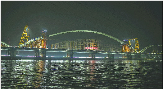 鋼箱梁頂推架設和拱肋提升安裝是整個項目的兩大主體工程。目前,主橋鋼箱梁按照先北岸再中跨最后南岸的施工順序已全部頂推就位。其中,北岸280米跨鋼箱梁用時9個月,主跨420米鋼箱梁用時6個月,南岸280米跨鋼箱梁僅用時55天。