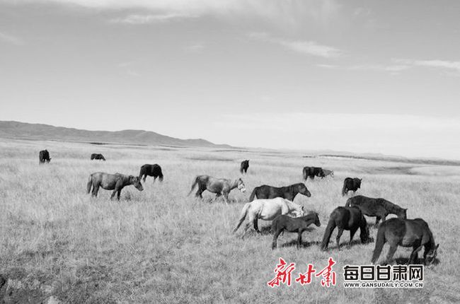 馬兒,似乎不再是草原的寵兒了。我們開車向草原深處漫溯,行進(jìn)了三四公里,終于看到路邊有十幾匹馬組成的馬群。這些河曲馬儀態(tài)優(yōu)美,安靜自在。