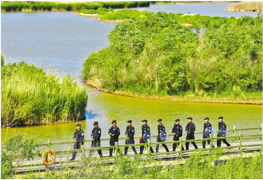 如今,和楊華章一樣,東營(yíng)在138公里沿黃生態(tài)帶、412公里濱海生態(tài)帶、118處城市濕地上,共有163名生態(tài)警長(zhǎng)守護(hù)著生態(tài)安全。東營(yíng)市公安局成立“守護(hù)母親河”生態(tài)保護(hù)領(lǐng)導(dǎo)小組,推行“生態(tài)警長(zhǎng)”制,各級(jí)公安機(jī)關(guān)“一把手”任轄區(qū)“生態(tài)總警長(zhǎng)”,建立局領(lǐng)導(dǎo)督導(dǎo)聯(lián)系制度,統(tǒng)籌推進(jìn)重點(diǎn)打擊治理,明確“生態(tài)警長(zhǎng)”35項(xiàng)職責(zé)任務(wù),筑起了服務(wù)保障“濕水林田湖草”一體的生態(tài)安全屏障。