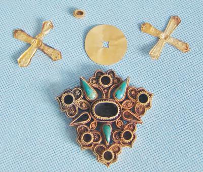 與十字架一起出土的嵌寶石掐絲金飾品,造型較為罕見,整體近似心形,有夾層,采用錘鍱、鏤雕、掐絲、焊接等多種工藝制成。正面有寶石嵌孔,寶石大部分脫落,僅存葉片形綠松石。背面有鈕,可以縫綴在衣帽上。結合出土背景來看,這件金飾品可能是象征十字蓮花的宗教文化飾品,造型以十字為骨架,下以中國傳統(tǒng)蓮花紋相襯。它的樣式與內蒙古錫林郭勒盟博物館收藏的元代嵌寶石掐絲金飾件有相似之處,類似的紋樣在內蒙古烏蘭察布發(fā)現(xiàn)的景教墓頂石上也可看到,是一件體現(xiàn)多元文化交融的珍貴文物。