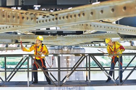 近日,蘭州鐵路局蘭州西工務(wù)段白銀橋隧車間橋隧工在炎炎烈日下爬橋頂、鉆橋底,為靖遠(yuǎn)鐵路黃河大橋“把脈問(wèn)診”,確保暑期、汛期鐵路運(yùn)行安全。新甘肅·甘肅日?qǐng)?bào)通訊員宋佳龍