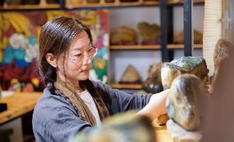 一塊黃河石,一支畫筆,若干顏料,魯婷聚精會神地以黃河石為畫布進行著彩繪創(chuàng)作。