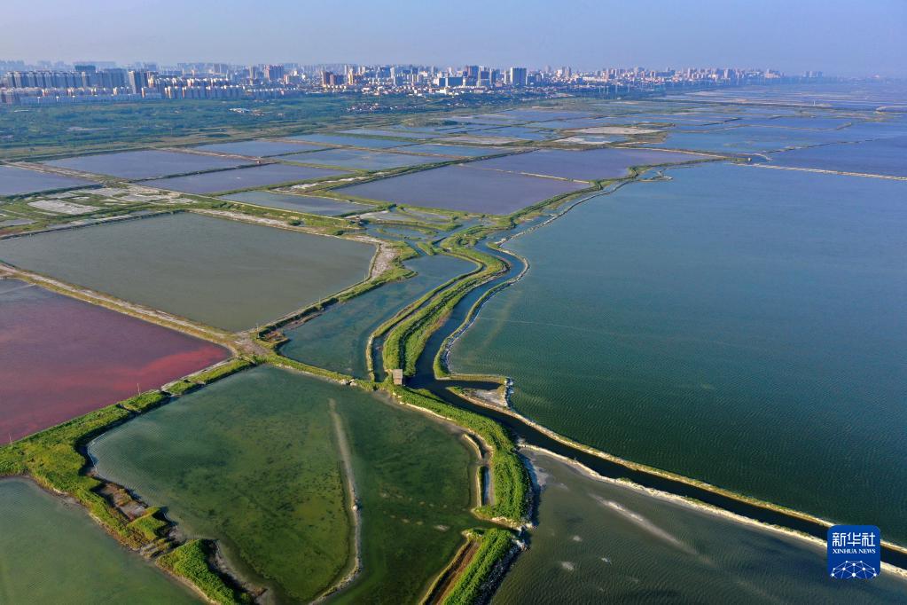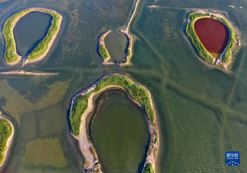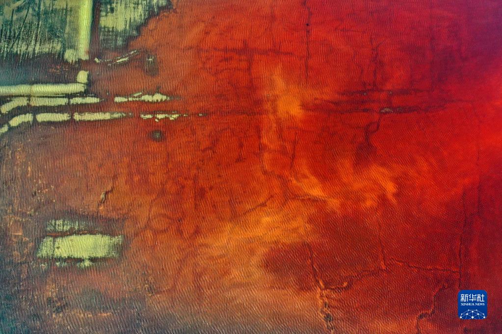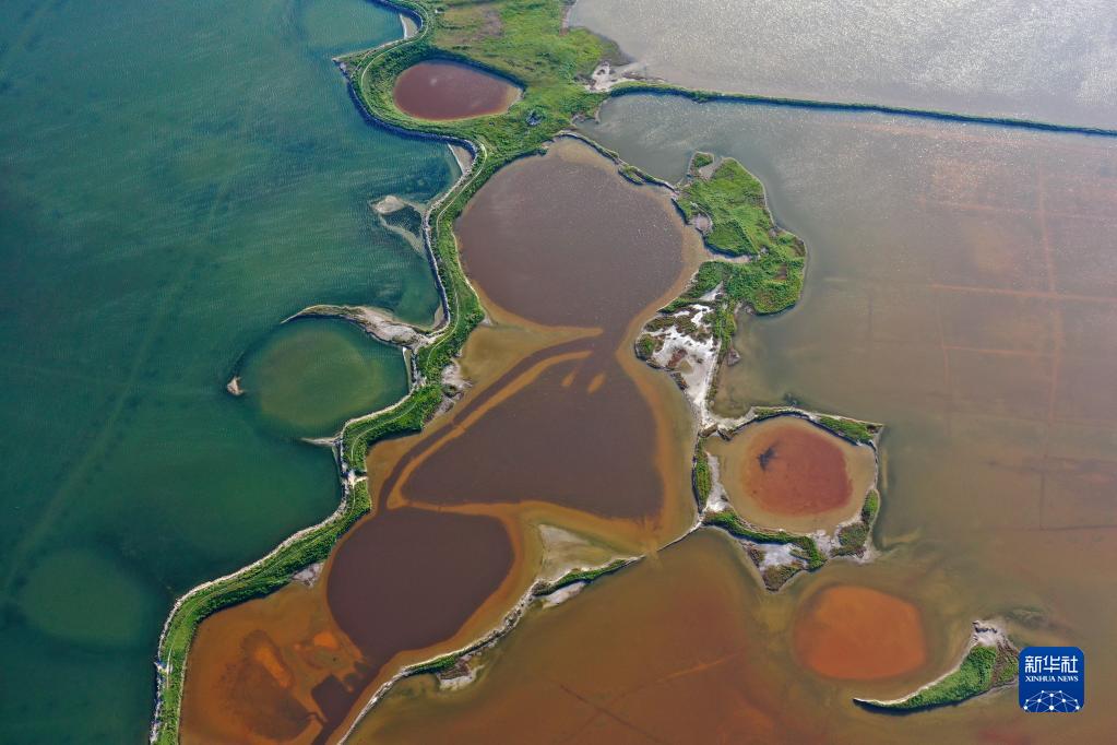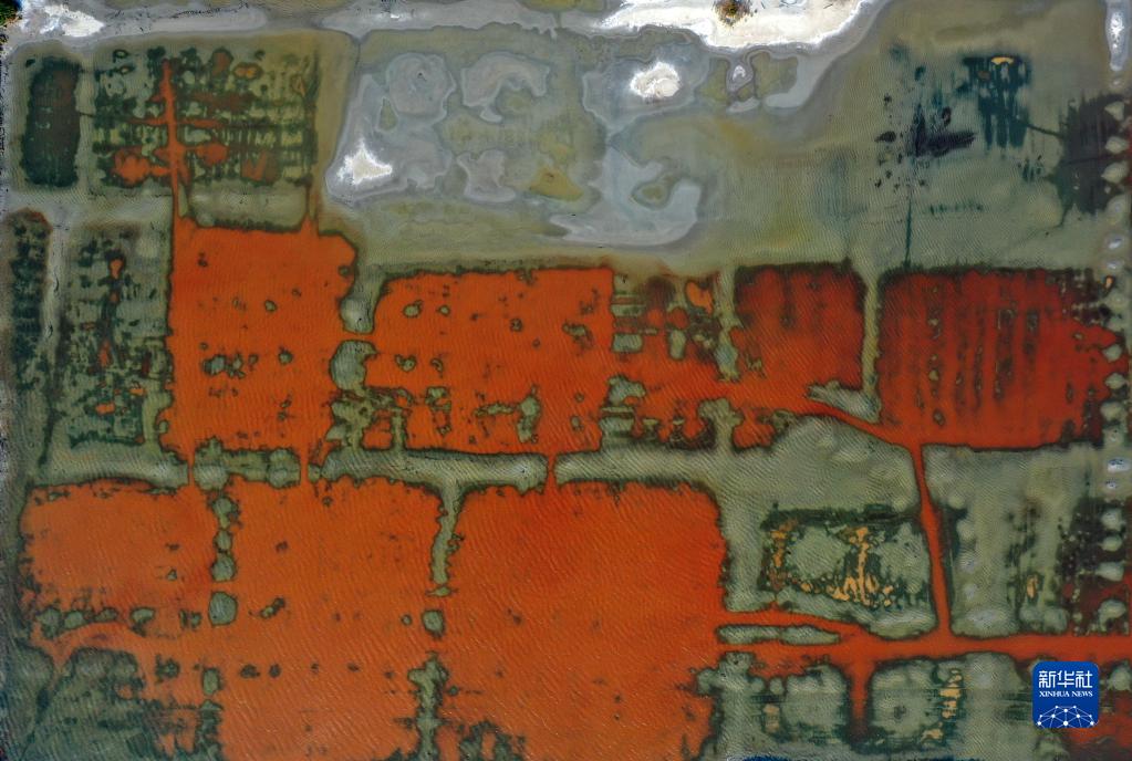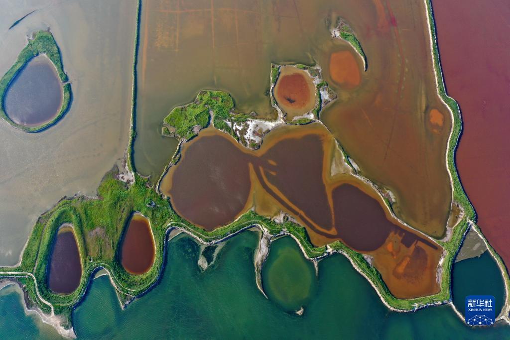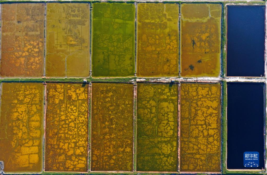 秋日時節(jié),從空中俯瞰位于山西省運(yùn)城市的鹽湖,景色如畫。