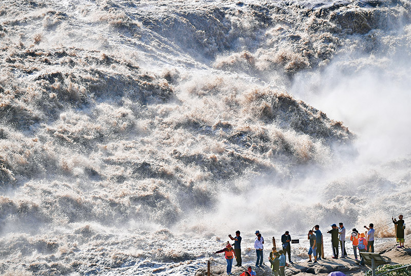 圖為2020年9月11日,游人在陜西省宜川縣黃河壺口瀑布景區(qū)參觀拍照。新華社記者邵瑞/攝