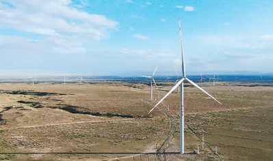 6月26日,在青海省海南藏族自治州共和縣拍攝的風力發(fā)電機。新華社記者張龍攝