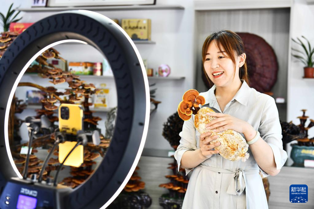 7月9日,在冠縣店子鎮(zhèn),主播在進行靈芝直播帶貨。