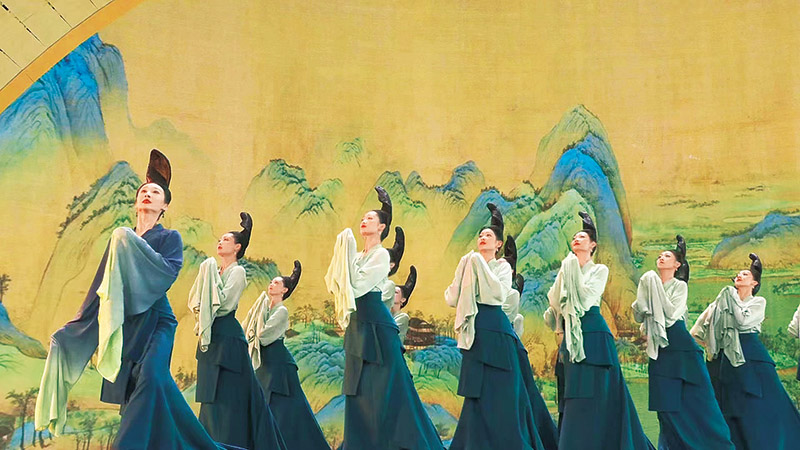 圖為圍繞傳世名作《千里江山圖》創(chuàng)排的舞蹈詩劇《只此青綠》亮相2022年中央廣播電視總臺春節(jié)聯(lián)歡晚會(視頻截圖)。中央廣播電視總臺供圖
