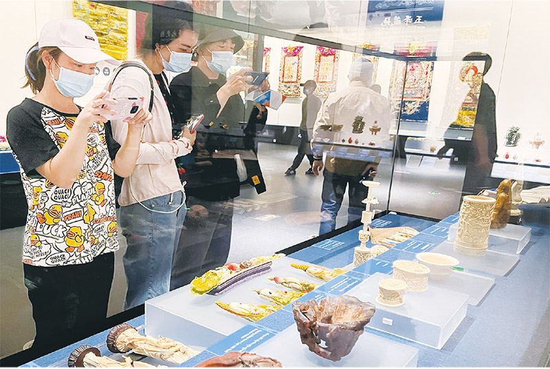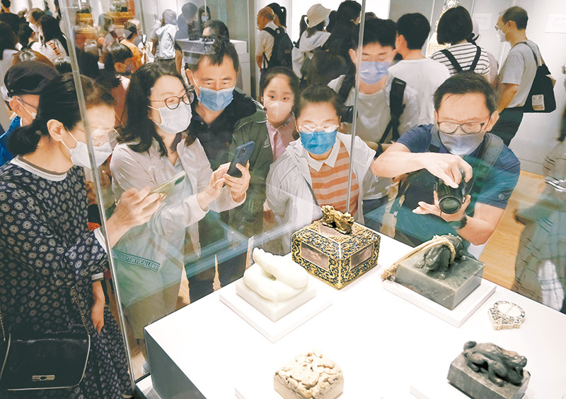 2022年7月3日,香港故宮文化博物館正式對公眾開放參觀。圖為觀眾在香港故宮文化博物館展廳內(nèi)參觀拍照。新華社記者王申/攝