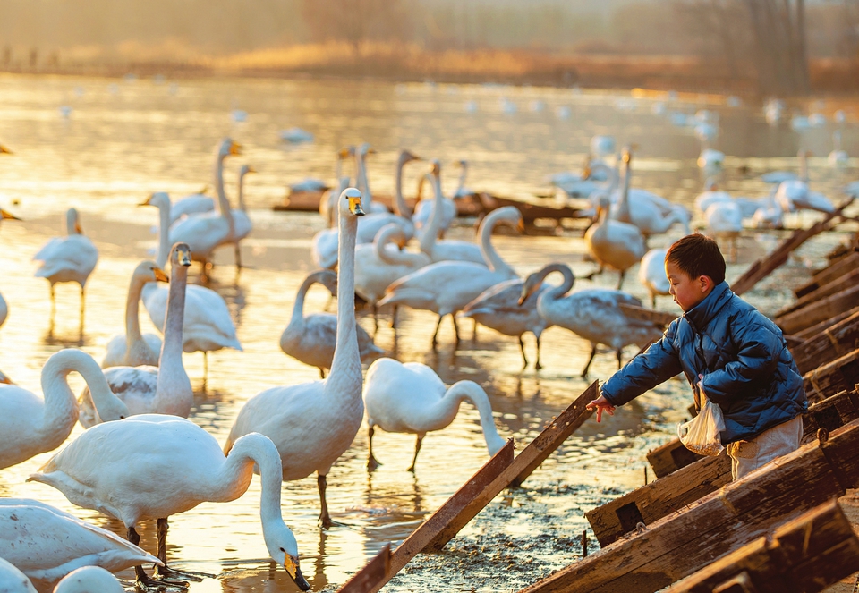 2022年12月30日,運城市平陸縣三灣黃河濕地,夕陽下一群白天鵝在波光粼粼的河面上游弋嬉戲,它們時而引吭高歌,時而翩翩起舞,在落日余暉映照下,金色的湖面和靈動的白天鵝構(gòu)成了冬日里一道亮麗的風(fēng)景線。(劉文禮攝)