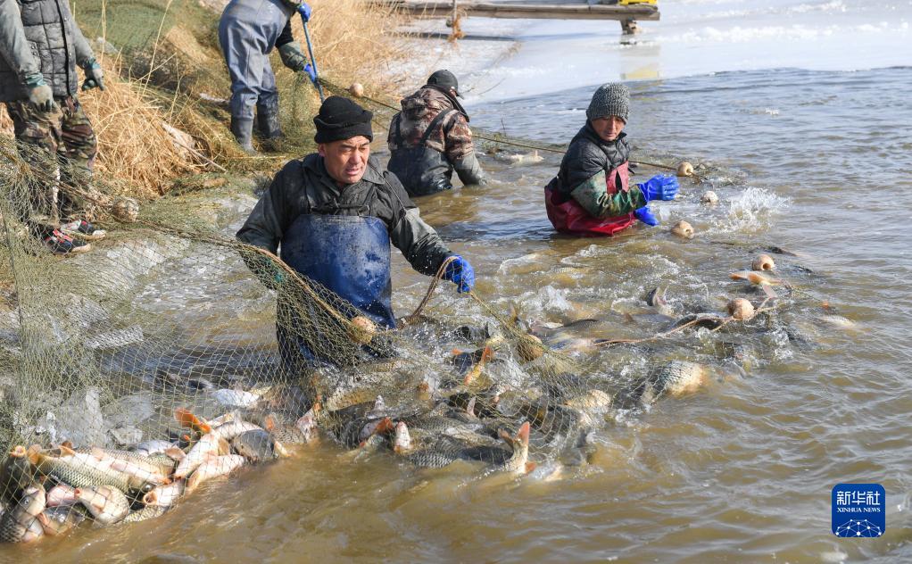 1月5日,達(dá)拉特旗樹林召鎮(zhèn)的村民在魚塘中捕魚。