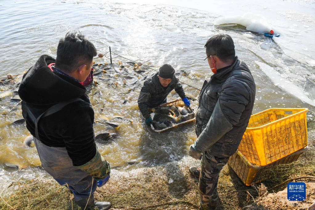 1月5日,達(dá)拉特旗樹林召鎮(zhèn)的村民在搬運(yùn)捕撈的魚。