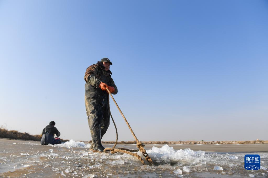 1月5日,達(dá)拉特旗樹林召鎮(zhèn)的村民在魚塘冰面上作業(yè)。